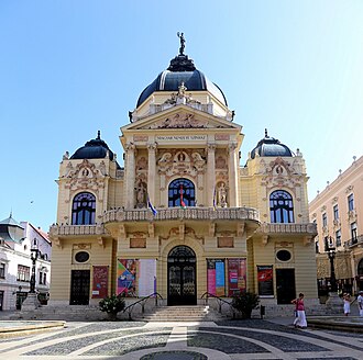 Built 1890-1895 by Adolf Láng and Antal Steinhardt for the city of Pécs, on the former site of a military hospital. Genius sculpture on the dome by György Kiss. Opened 5 Oct 1895 with Ferenc Erkel's drama Bánk bán. 1986-1991 closed for major renovations, modernization of stage technology and installation of a revolving stage. (English)