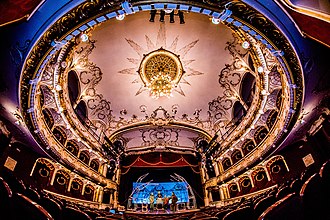 Built 1899-1900 as Szigligeti Színhzáz/Stadttheater for the city of Nagyvárad/Großwardein by Ferdinand Fellner & Hermann Helmer. The building of the theatre was made possible by a foundation set up by Hungarian merchants. Opened 15 Oct 1900 with a gala including works by A. Váradi and Ferenc Erkel. Hungarian coat of arms in tympanon removed in 1919 when Oradea became a part of Romania, tympanon relief decoration removed in 1928. Renamed Teatrul Maria Regina. Later renamed Teatrul de Stat. Renovated in 1933 and in 1997/1998. Ca. 1000 seats. (English)