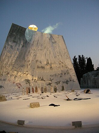 In Greek antiquity the effect was achieved with a crane, probably already used for the construction of buildings, which was adapted for use in the theatre as a flying machine. It consisted of an inclined shaft fitted with a pulley on which ropes and a hook ran, operated by a winch, although there are no precise references as to how exactly it worked. It seems likely that it was fixed to the top of the skene (paraskenia), behind the back wall, which concealed part of its function. It was able to raise and lower people vertically, although it is also possible that it could have been able to fly with a change of direction, as some references indicate that the crane could rotate on its base, so creating a panning action.
