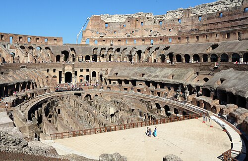 The number of spectators in the amphitheatre compared to the theatre was much greater. The Colosseum in Rome (Q615) could accommodate up to 70,000 spectators. There were 76 entrances through the arches on the ground floor, each marked with a number. The spectators, from outside, could already tell, with ticket in hand, where it was best to enter. Once inside, they found themselves in a circular corridor (ambulacrum), which led them under the tiers of seats, which they accessed by climbing the stairs and passing through the vomitorium to the auditorium. Any doubts about which way to go were resolved by signs with directions.
