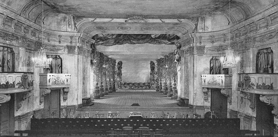 The theatre has a 400-seat auditorium. Although the entire group of spectators have a good view of the stage, the ideal point from which to best experience the perspective of the stage was where the King’s seats were located in the front row. The sightlines are good as the rows of seats are parallel to each other and the hall is sufficiently inclined to allow all the spectators to see. There was a break in the rectangle of the hall with a central baroque oval linking actor and spectator. Later, it was removed, and benches were placed around it. A peculiarity of this theatre is that a curtain can be lowered between the widest main part of the auditorium and the last eleven rows of benches. In Gustav III’s time it was used to separate the high nobility and royalty from the bourgeoisie and lower nobility during intermissions and at the end of performances. The auditorium does not have balconies, but has six boxes in the middle, three on each side. They were used to seat musicians who could not fit in the orchestra pit and for kings on official occasions.