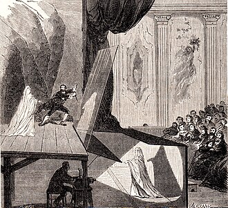 John Henry Pepper demonstrated this illusionary technique called Peppers Ghost A brightly lit figure below the stage or in the wings is reflected in a pane of glass placed at an angle on stage. To the audience, it appears as if the ghost is on stage.