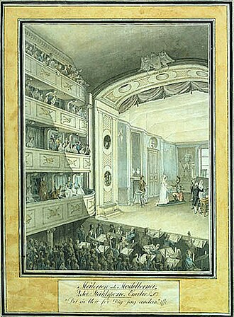 Royal Opera House, built by Carl Frederik Adelcrantz for King Gustav III. Opened 30 Sep 1782. Site of the assassination of King Gustav III during a masqued ball on 16 Mar 1792. Demolished 1892 in favour of the new Kungliga Operan. (English)