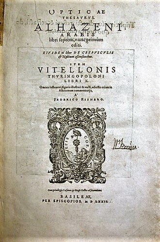 | English | Book of optics | seven-volume treatise on optics and other fields of study composed by the medieval Arab scholar Ibn al-Haytham, known in the West as Alhazen or Alhacen (965–c. 1040 AD). |