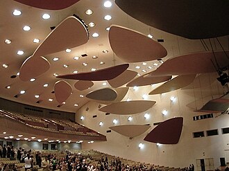 University assembly and concert hall of the Universidad Central de Venezuela. Built 1953 by Carlos Raúl Villanueva, with acoustic interior decoration (Floating Clouds) by Alexander Calder. Opened 3 Dec 1953. 2700 seats. (English)