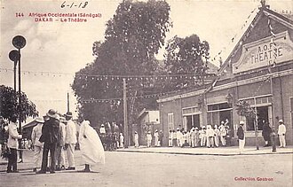 Le théâtre de Dakar : revenons sur le premier (et a priori seul) théâtre ayant existé à Dakar avant Sorano. Ledit théâtre était situé à l’angle de l’avenue Roume (devenue Léopold Sédar Senghor) et de la rue Carnot, sur la parcelle désormais vierge située dans le haut de la place de l’Indépendance. L’AOF théâtre, comme il est indiqué sur sa façade, serait devenu par la suite le Bataclan puis le théâtre du Palais. (French)