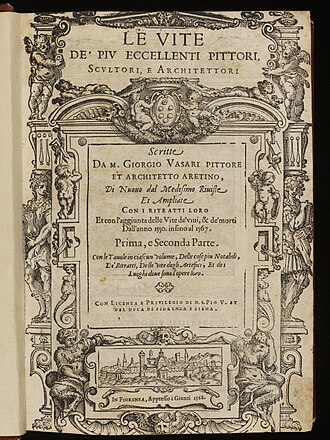 | English | Vite dei più eccellenti architetti pittori et scultori italiani da Cimabue insino a' tempi nostri | series of artist biographies by Giorgio Vasari |