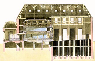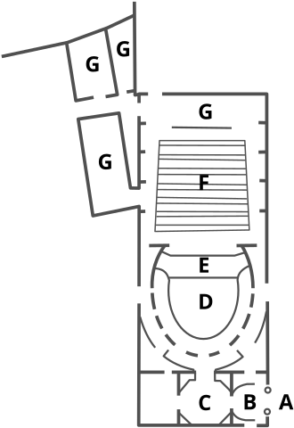 A. Entrée principale.B. Vestibule.C. Foyer octogonal.D. Parterre entouré des galeries.E. Fosse d'orchestre.F. Scène.G. Loges et coulisses. (French)