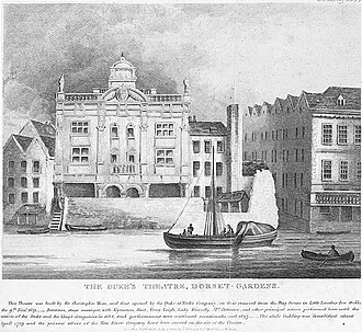 Built 1671 by Sir Christopher Wren, on the former grounds of Dorset House (which had been destroyed by the Great Fire). Also known as Dorset Garden Theatre. Used for performances by The Duke's Players. After 1682, mostly used for entertainment shows, wrestling shows, and musical competitions. 1689 renamed Queen's Theatre. 1000 seats. Demolished 1709. (English)