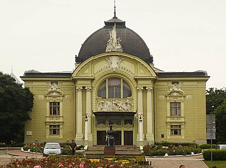 The theatre facade stands out with its front door arch, realized in the Viennese baroque style. The main entrance is decorated with sculptural structures inspired by Greek mythology, made by the Viennese artist Ernst Hegenbarth. (English)