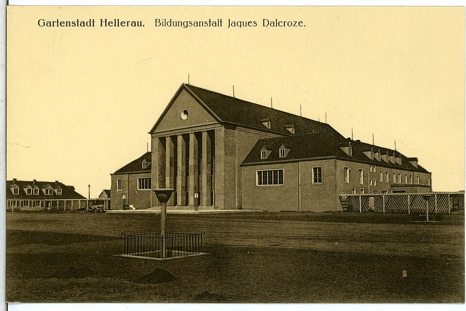 In October 1909, Émile Jacques-Dalcroze (Q22937), on a tour of Europe to spread his ideas about rhythmic gymnastics and the practice of his school, arrived in Dresden. Enthusiastic, the brothers Wolf and Harald Dohrn proposed they build a Bildungsanstalt (School of Education) in the garden city associated with their furniture construction company in Hellerau. In its simplicity and harmony, the style of the Hellerau buildings was in keeping with Dalcroze's ideology of eurythmy. In the new space of this garden city, Art, Industry and Life were to unite.
