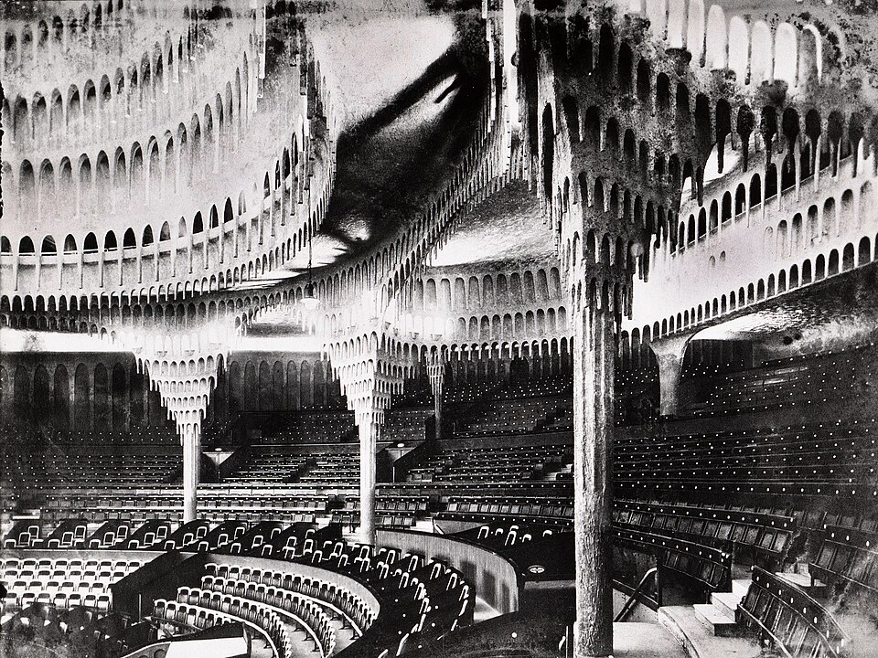 The Total Theatre was designed by Erwin Piscator and Walter Gropius. This immersive theatre concept aimed to abolish the separation between actors and audience, challenging the spectator to actively participate in what was happening on stage.