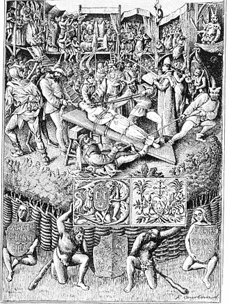 Een illustratie van Hubert Cailleau toont het toneelbeeld van "Het lijden en de verrijzenis van de Verlosser". Deze dramatische voorstelling die het lijdensverhaal van Christus voorstelt, van het laatste avondmaal tot de kruisiging, vond plaats in 1547 en duurde 25 dagen. Hoewel het schilderij uit de Renaissance stamt, is het een van de beste voorbeelden van de theatervoorstelling uit de Middeleeuwen.