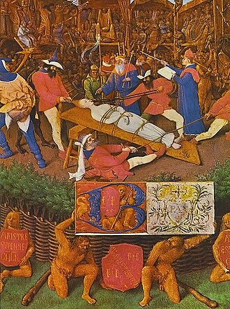 Dankzij een schilderij van Jean Fouquet, "Het martelaarschap van de heilige Apollonia" uit het midden van de 15e eeuw, kunnen we meer aspecten van de middeleeuwse enscenering begrijpen. De handeling van Het Mysterie van de Heilige Apollonia speelt zich af in Alexandrië. Het schilderij toont: Apollonia de maagd, een rechter, een oude man, de regisseur van de voorstelling met de dirigeerrol (G.02), het schrift en een nar. We zien de herenhuizen: Het paradijs, het orkest, de lege troon, twee toeschouwersboxen en de Hel. In tegenstelling tot het schilderij van Valenciennes is de meerwaarde van het schilderij van Fouquet dat het de toeschouwers, die overal verspreid zitten, situeert. Ook hier wordt de plaats van handeling symbolisch weergegeven door van elkaar gescheiden scènes. Hoewel de meeste herenhuizen bedoeld zijn als voorstellingsruimten, zijn sommige, in onduidelijke volgorde geplaatst, gereserveerd voor musici of bevoorrechte toeschouwers. Het schilderij laat zien hoe middeleeuwse ensceneringen de ruimtes tussen de herenhuizen, de zogenaamde boxen, gebruikten voor de voorstelling. Als een acteur zijn herenhuis verlaat en in de boxen optreedt, worden de boxen volgens afspraak een ander deel van zijn huis. Als hij van het ene huis naar het andere moet reizen, stelt de grond waarop hij loopt de ruimte voor die de twee plaatsen scheidt. De boxen zijn overal en kunnen worden bezet door zowel het publiek als de acteurs, die door elkaar lopen.